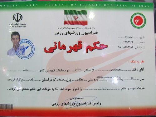 وی مقام سومی بین المللی مسابقات تهران را امسال کسب کرده و تاکنون ۵ دوره مقام اولی ولایتی را به دست آورده است.