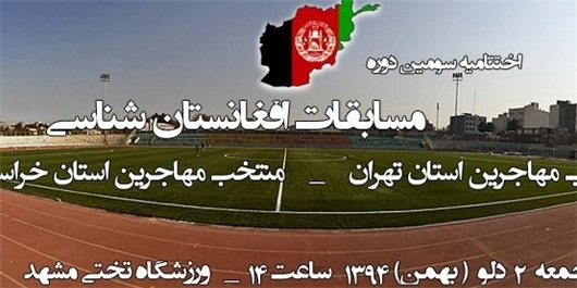 عصر روز جمعه (2دلو) تیمهای منتخب فوتبال مهاجرین استان تهران و خراسان رضوی در اختتامیه سومین دوره مسابقات افغانستان شناسی به مصاف یکدیگر میروند.